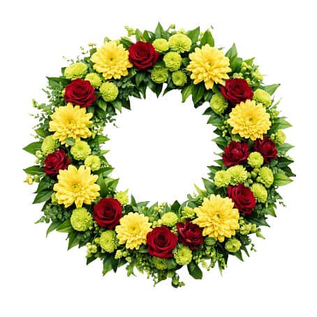 Alla våra produkter är unika och ser olika ut beroende på vilken florist som utför din beställning. Floristen skapar utifrån dina val, säsong för blommor och butikens egna sortiment. Rundbunden begravningskrans med röda rosor och gula snittblommor. Bilden är endast ett exempel.
