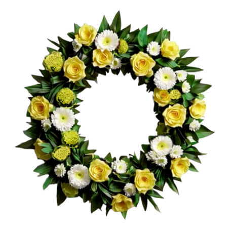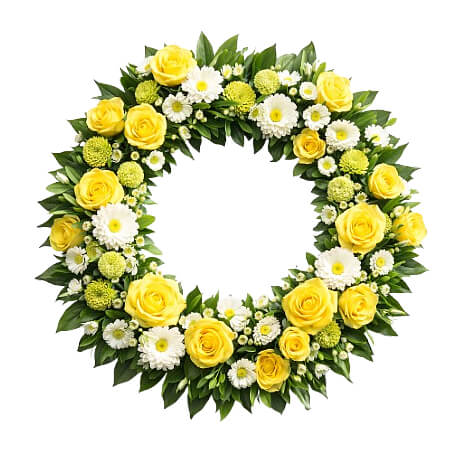 Alla våra produkter är unika och ser olika ut beroende på vilken florist som utför din beställning. Floristen skapar utifrån dina val, säsong för blommor och butikens egna sortiment. Rundbunden begravningskrans med gula rosor och vita snittblommor. Bilden är endast ett exempel.