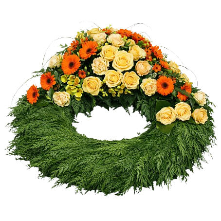 Alla våra produkter är unika och ser olika ut beroende på vilken florist som utför din beställning. Floristen skapar utifrån dina val, säsong för blommor och butikens egna sortiment. Begravningskrans med orange och gula snittblommor och grönt. Bilden är endast ett exempel.