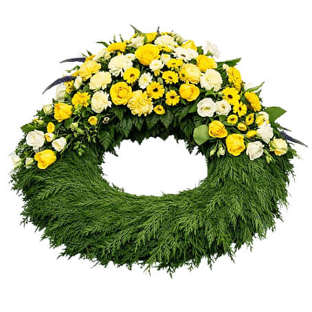 Alla våra produkter är unika och ser olika ut beroende på vilken florist som utför din beställning. Floristen skapar utifrån dina val, säsong för blommor och butikens egna sortiment. Begravningskrans med vita och gula snittblommor och grönt. Bilden är endast ett exempel.