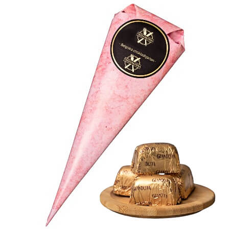 Butiken väljer en chokladstrut ur sitt egna sortiment.