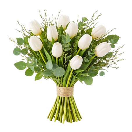 Alla våra produkter är unika och ser olika ut beroende på vilken florist som utför din beställning. Floristen skapar utifrån dina val, säsong för blommor och butikens egna sortiment. Tulpanbukett med vita tulpaner och grönt. Bilden är endast ett exempel.